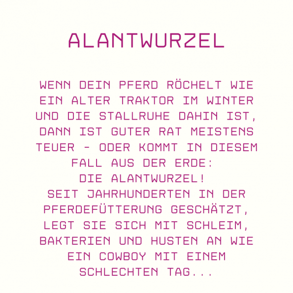 Wenn dein Pferd röchelt wie ein alter Traktor im Winter und die Stallruhe dahin ist, dann ist guter Rat meistens teuer – oder kommt in diesem Fall aus der Erde: Die Alantwurzel! Seit Jahrhunderten in der Pferdefütterung geschätzt, legt sie sich ohne Angst mit Schleim, Bakterien und Husten an. Diese unscheinbare Wurzel hat es besonders [...]