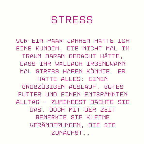 Vor ein paar Jahren hatte ich eine Kundin, die nicht mal im Traum daran gedacht hätte, dass ihr Wallach irgendwann mal Stress haben könnte. Er hatte alles: einen großzügigen Auslauf, gutes Futter und einen entspannten Alltag – zumindest dachte sie das. Doch mit der Zeit bemerkte sie kleine Veränderungen, die sie zunächst nicht einordnen konnte: [...]