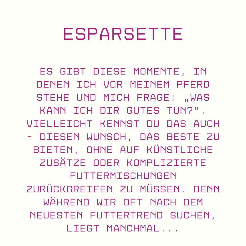 Ob du nun ein schwerfuttriges Rentnerpony, einen temperamentvollen Blüter oder einen vierbeinigen Feinschmecker im Stall hast - mit Esparsette fütterst du smart, natürlich und ganz nah am Ursprung. Das ist Pferdeliebe in ihrer praktischsten Form!