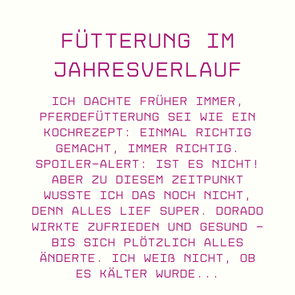 Ich dachte früher immer, Pferdefütterung sei wie ein Kochrezept: einmal richtig gemacht, immer richtig. Spoiler-Alert: Ist es nicht! Aber zu diesem Zeitpunkt wusste ich das noch nicht, denn alles lief super. Dorado wirkte zufrieden und gesund - bis sich plötzlich alles änderte. Ich weiß nicht, ob es kälter wurde oder der Frühling kam, aber irgendwas schien anders als sonst zu sein. Er zeigte mir das ziemlich deutlich, als er plötzlich schlapp wirkte, obwohl ich weiter brav das Futter aus dem Sommer gegeben hatte. Naja, als wäre ich selbst im Dezember noch in Flipflops und Tank-Top rumgelaufen – macht halt wenig Sinn, oder?