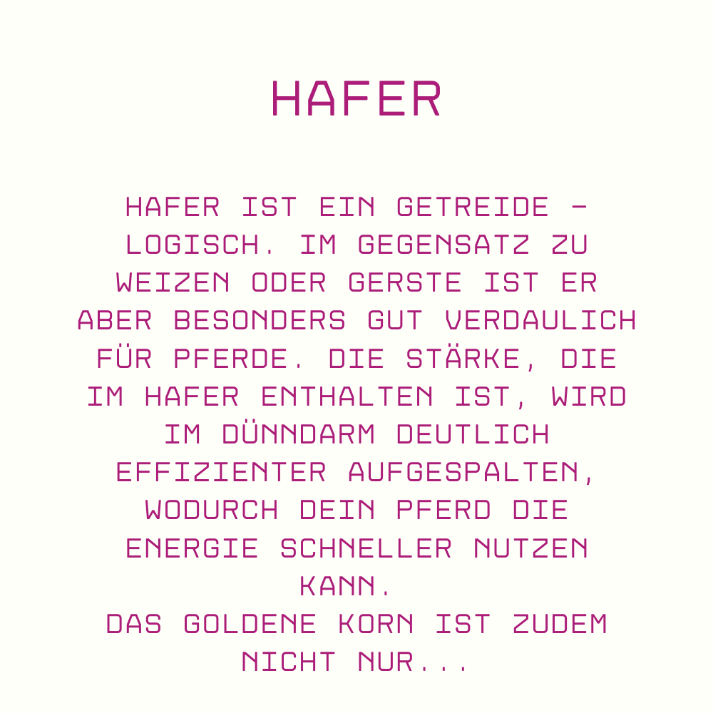 Hafer ist ein Getreide - logisch. Im Gegensatz zu Weizen oder Gerste ist er aber besonders gut verdaulich für Pferde. Die Stärke, die im Hafer enthalten ist, wird im Dünndarm deutlich effizienter aufgespalten, wodurch dein Pferd die Energie schneller nutzen kann.