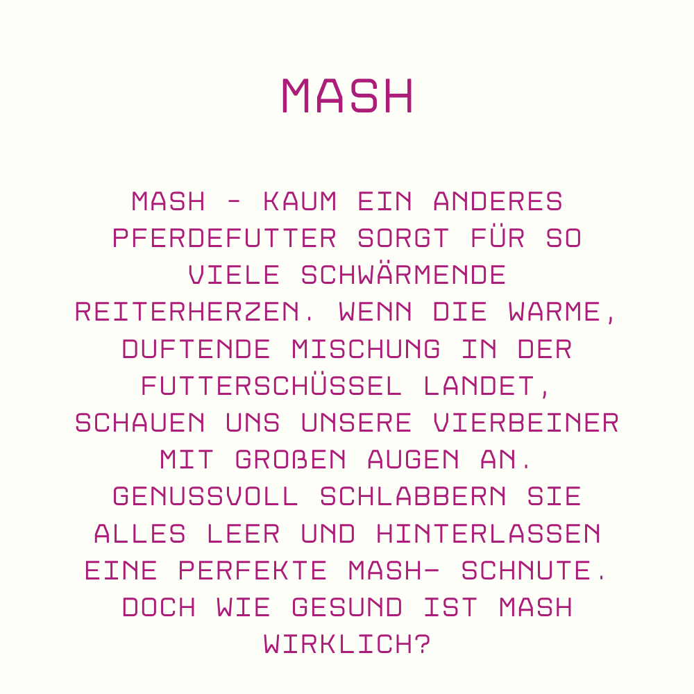 Mash – kaum ein anderes Pferdefutter sorgt für so viele schwärmende Reiterherzen. Wenn die warme, duftende Mischung in der Futterschüssel landet, schauen uns unsere Vierbeiner mit großen Augen an. Genussvoll schlabbern sie alles leer und hinterlassen eine perfekte Mash- Schnute.