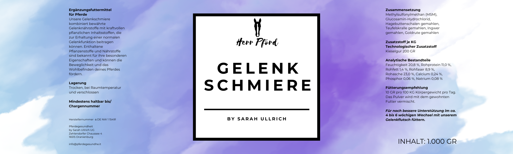 Die GELENKSCHMIERE bietet eine ausgewogene Kombination bewährter Nährstoffe und pflanzlicher Bestandteile, die gezielt zur Unterstützung der normalen Gelenkfunktion bei Pferden beitragen können. Die Rezeptur ist ideal abgestimmt für Pferde mit erhöhter Beanspruchung, älteren Tieren oder als Ergänzung in Zeiten gesteigerter Anforderungen an den Bewegungsapparat.