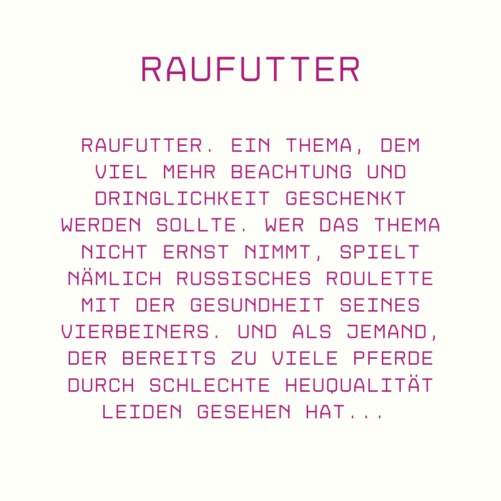 Raufutter. Ein Thema, dem viel mehr Beachtung und Dringlichkeit geschenkt werden sollte. Wer das Thema nicht ernst nimmt, spielt nämlich russisches Roulette mit der Gesundheit seines Vierbeiners. Und als jemand, der bereits zu viele Pferde durch schlechte Heuqualität leiden gesehen hat (und leider auch mein eigenes), weiß ich genau wovon ich spreche.