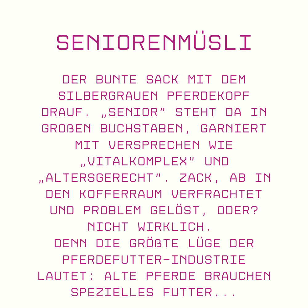 Die Futtermittelindustrie verkauft keine Lösungen, sie verkauft Bequemlichkeit… und Angst. Die Angst, etwas falsch zu machen oder dass das Pferd etwas nicht bekommt, was es braucht. Aber weißt du, was dein Senior wirklich braucht? Deine Aufmerksamkeit, dein Mitdenken und die Bereitschaft, dich mit der Fütterung auseinanderzusetzen – jenseits von bunten Verpackungen und Marketing-Versprechen.