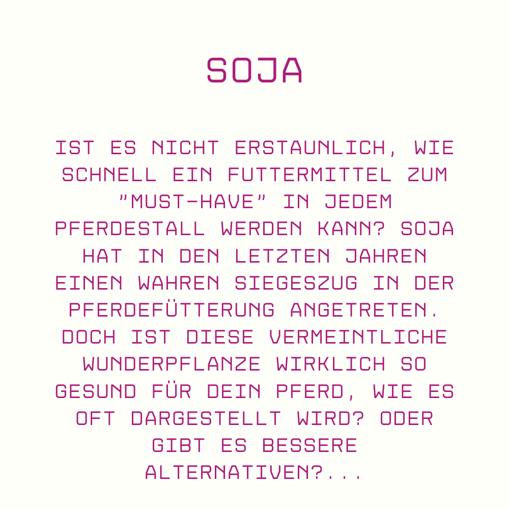 Ist es nicht erstaunlich, wie schnell ein Futtermittel zum "Must-have" in jedem Pferdestall werden kann? Soja hat in den letzten Jahren einen wahren Siegeszug in der Pferdefütterung angetreten. Doch ist diese vermeintliche Wunderpflanze wirklich so gesund für dein Pferd, wie es oft dargestellt wird? Oder gibt es bessere Alternativen?